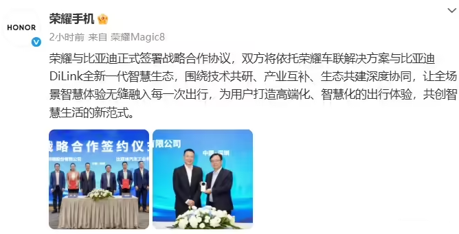 10月22日,荣耀宣布与比亚迪正式签署战略合作协议,官方称,“双方将依托荣耀车联解决方案与比亚迪DiLink全新一代智慧生态,围绕技术共研、产业互补、生态共建深度协同,让全场景智慧体验无缝融入每一次出行,为用户打造高端化、智慧化的出行体验,共创智慧生活的新范式。”